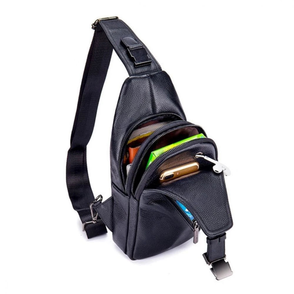 Produzida em couro 100% selecionado. A organização interna é otimizada com múltiplas camadas, permitindo separar o celular, carregadores e documentos, enquanto a saída para fone de ouvido adiciona praticidade para quem está sempre em movimento.