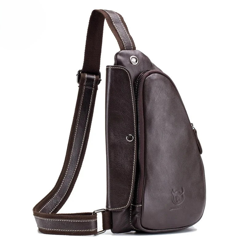 Confeccionada em couro 100% selecionado, a peça possui uma textura rica e durável. O modelo conta com um compartimento principal de fácil acesso e um bolso frontal exclusivo com aba e botão de pressão, perfeito para guardar chaves ou objetos que precisam estar à mão. O detalhe do ilhós metálico no topo permite a passagem de fones de ouvido, unindo o clássico do couro à tecnologia moderna.